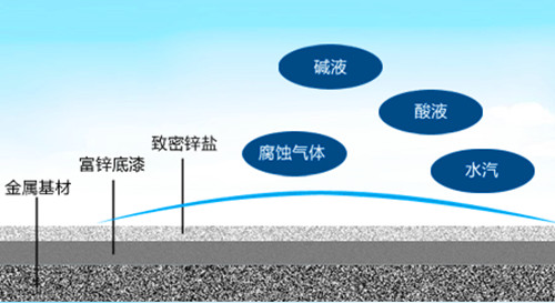 當(dāng)涂膜上有部位損傷后,露出基體金屬,在較小面積內(nèi)腐蝕電流能流向鋼鐵露出部分,則鋅的產(chǎn)物就沉積在此處形成一層保護膜,延緩腐蝕繼續(xù)發(fā)生。